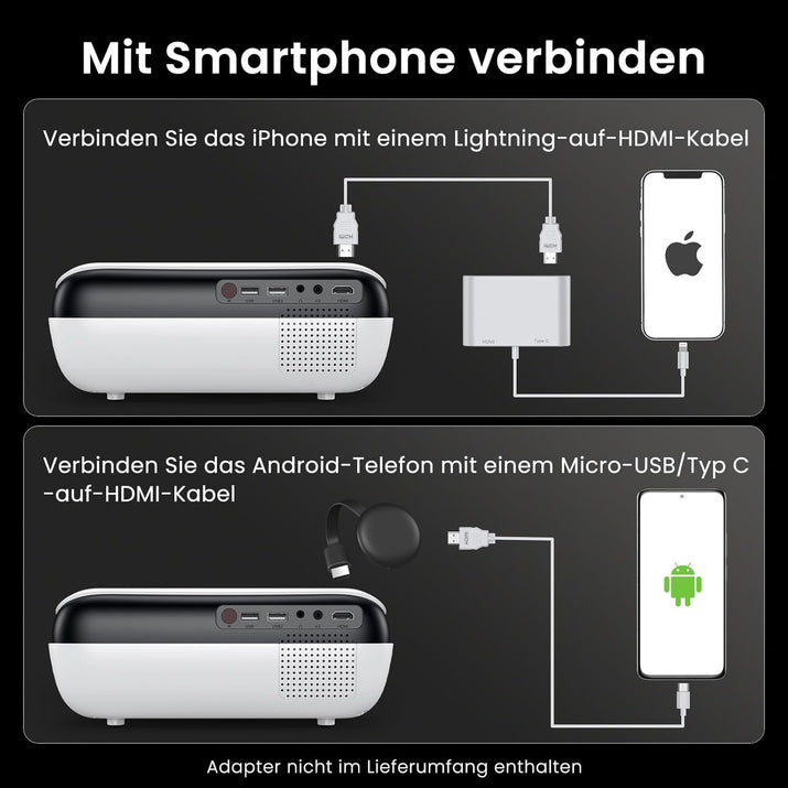 Der Beamer ist kompatibel mit Smartphones, Spielekonsolen und anderen Geräten über seine HDMI- und USB-Anschlüsse. Mit einem Fire TV Stick können Sie Streaming-Dienste wie Netflix oder Prime Video problemlos nutzen.